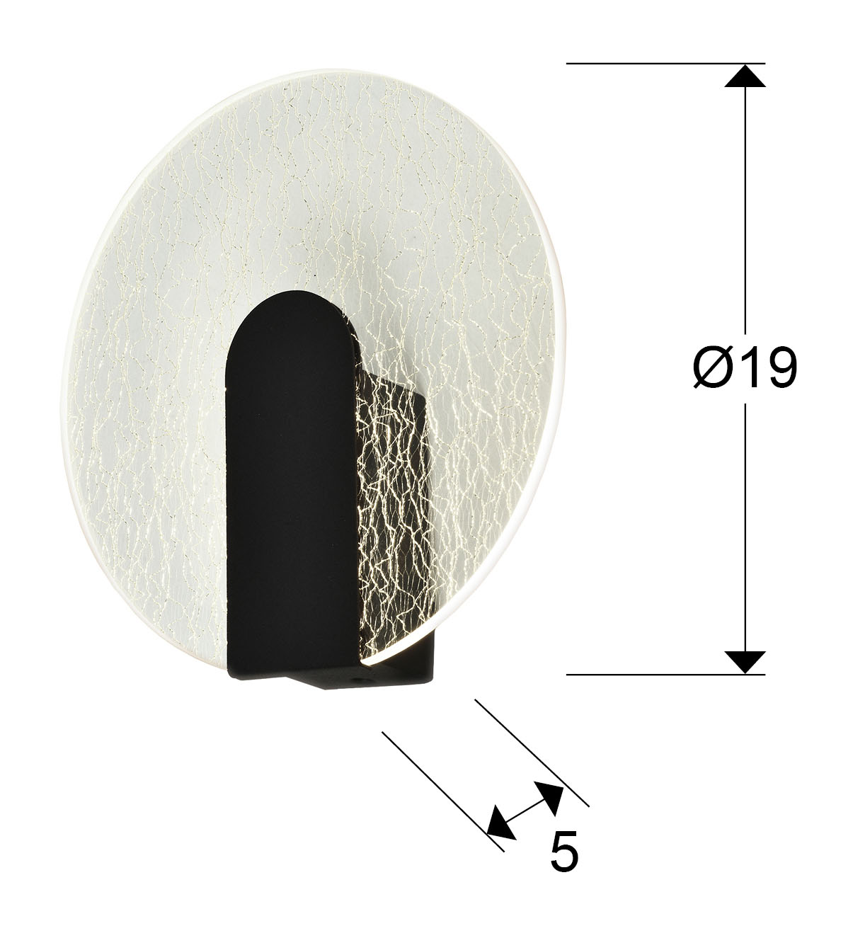 Lámpara de pared realizada en metal y aluminio, acabado negro mate. Difusor redondo de acrílico transparente, decoración microimpresa: textura de rayas doradas aleatorias. 5,5W LED, 450 lm, 3.000K