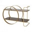 Las formas esenciales, lineales y circulares, realzan su estética de fuerte personalidad, que se compone de una estructura de metal pintado con acabado oro mate, dos baldas de porcelánico y una tapa ahumada.