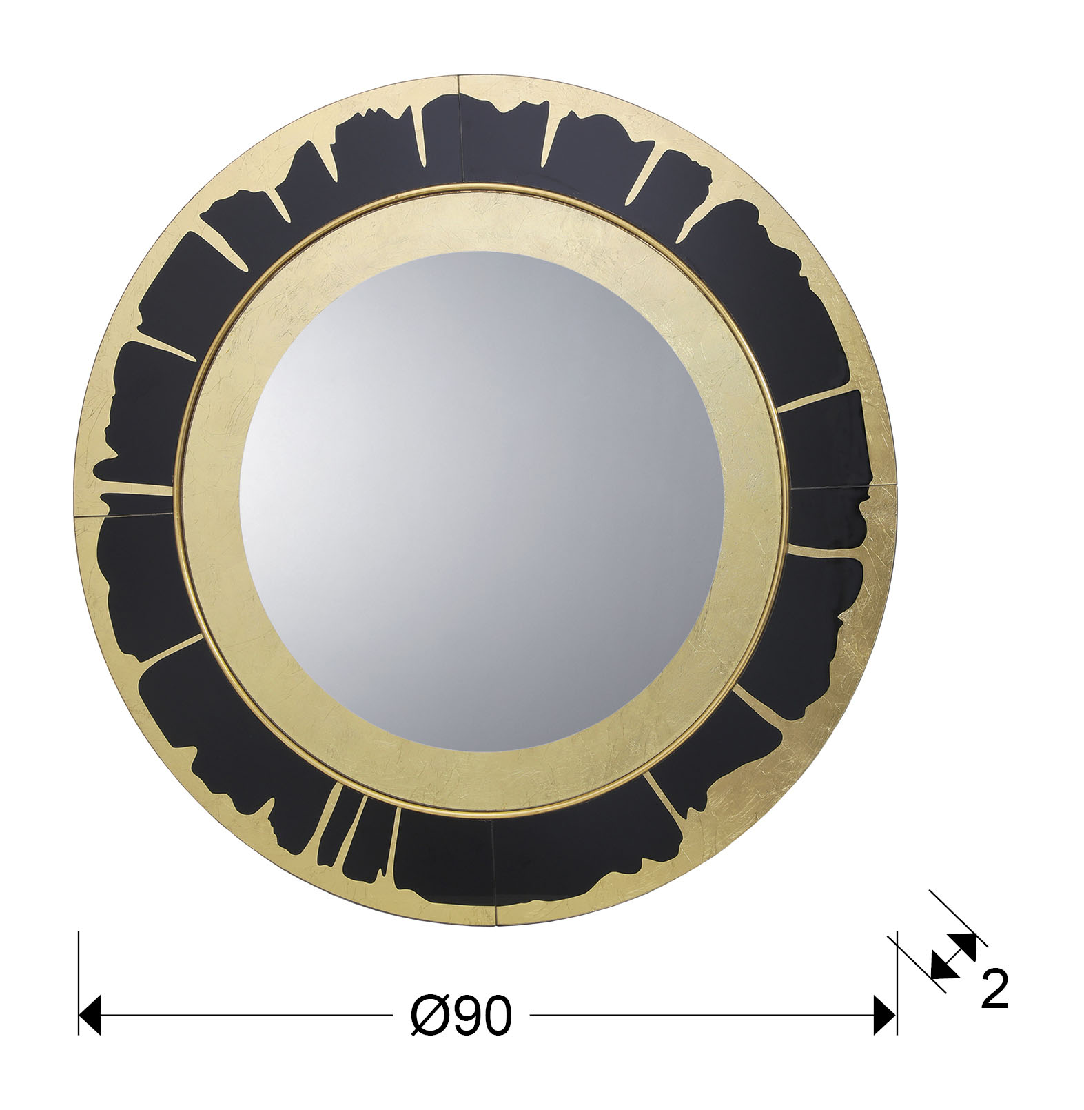 Espejo con luna central y marco de cristal con detalles en PAN DE ORO y negro. Trasera de DM lacado en negro.