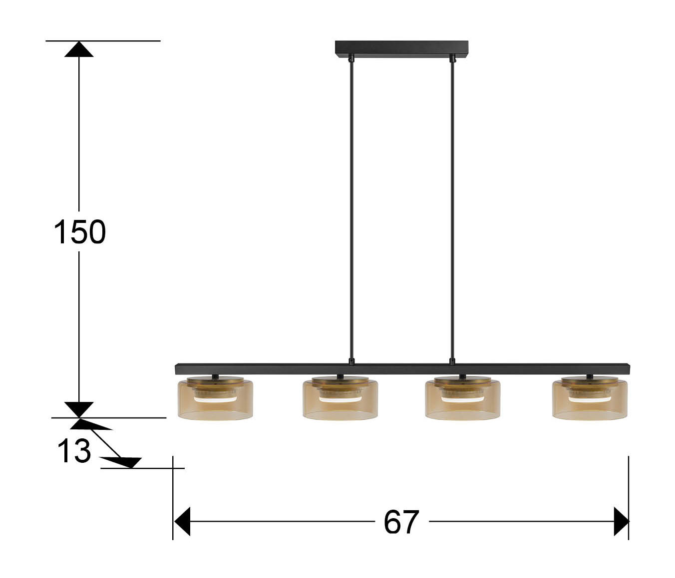 Lámpara realizada en metal acabado negro mate y oro. 4 Tulipas de cristal ambar. Regulable en altura.