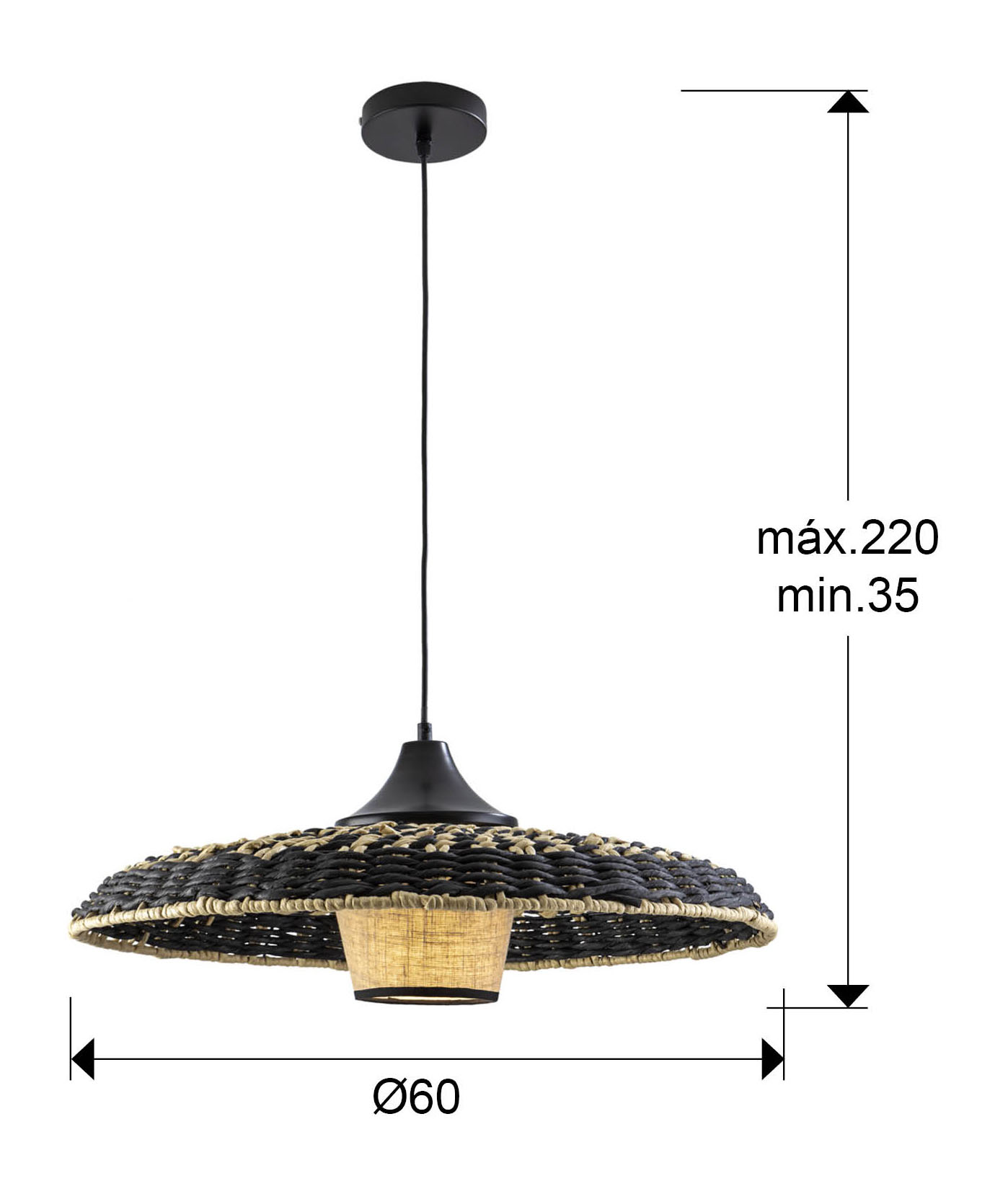 Lámpara de 1 luz realizada en metal acabado negro. Pantalla doble: exterior de cuerda de papel trenzado en combinado beis y negro, pantalla interior textil.