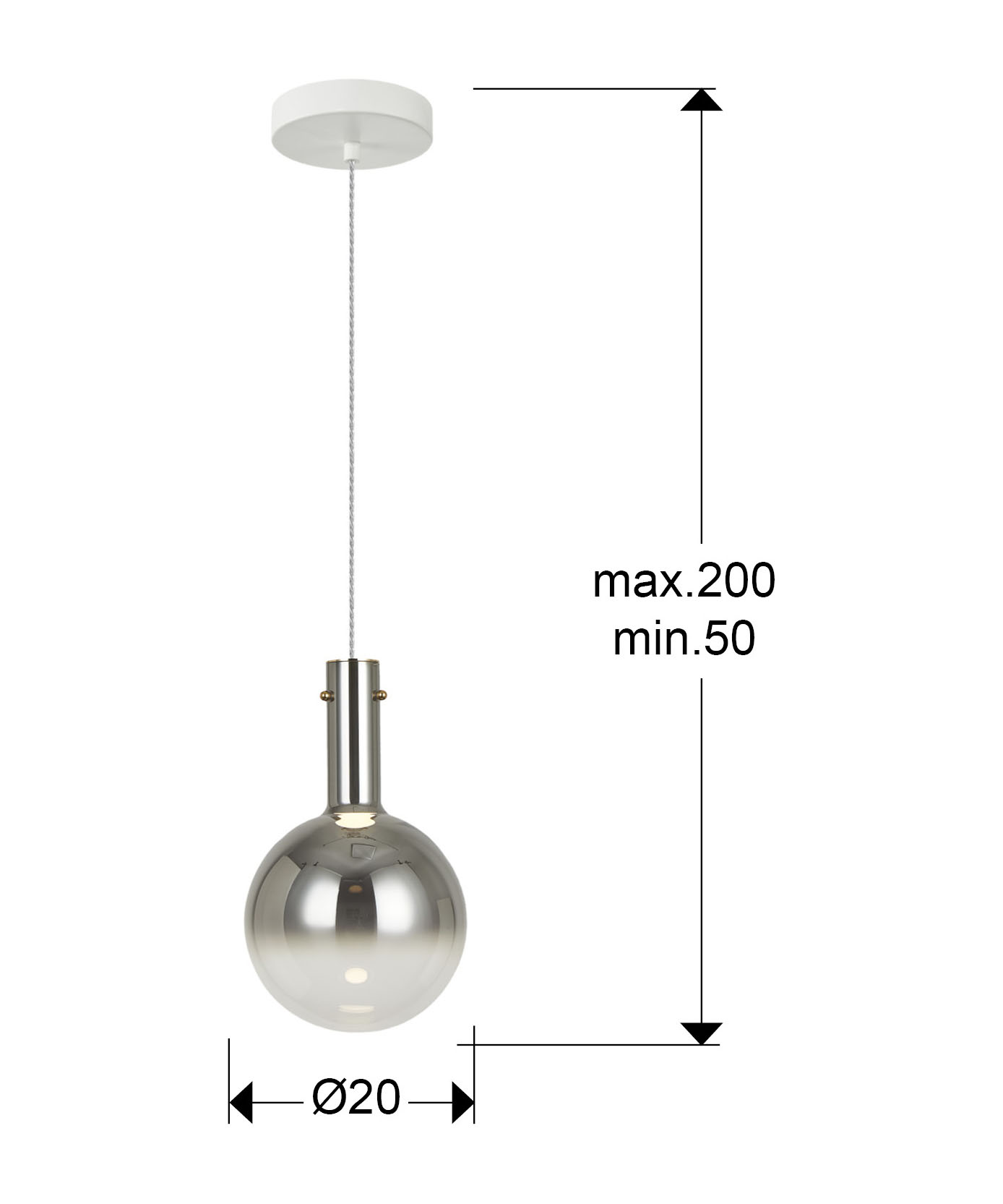 Lámpara realizada en metal, acabado blanco mate. Tulipa de cristal soplado de Ø20 cm, color gris smoke espejado. Regulable en altura. 4W LED, 340 lm, 3000K.
