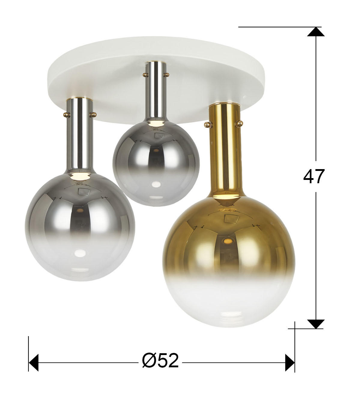 Plafón de techo realizado en metal, acabado blanco mate. Tulipas de cristal soplado de Ø15, 20 y 25 cm, color gris smoke espejado y oro espejado. 15W LED, 1.542 lm, 3.000K.