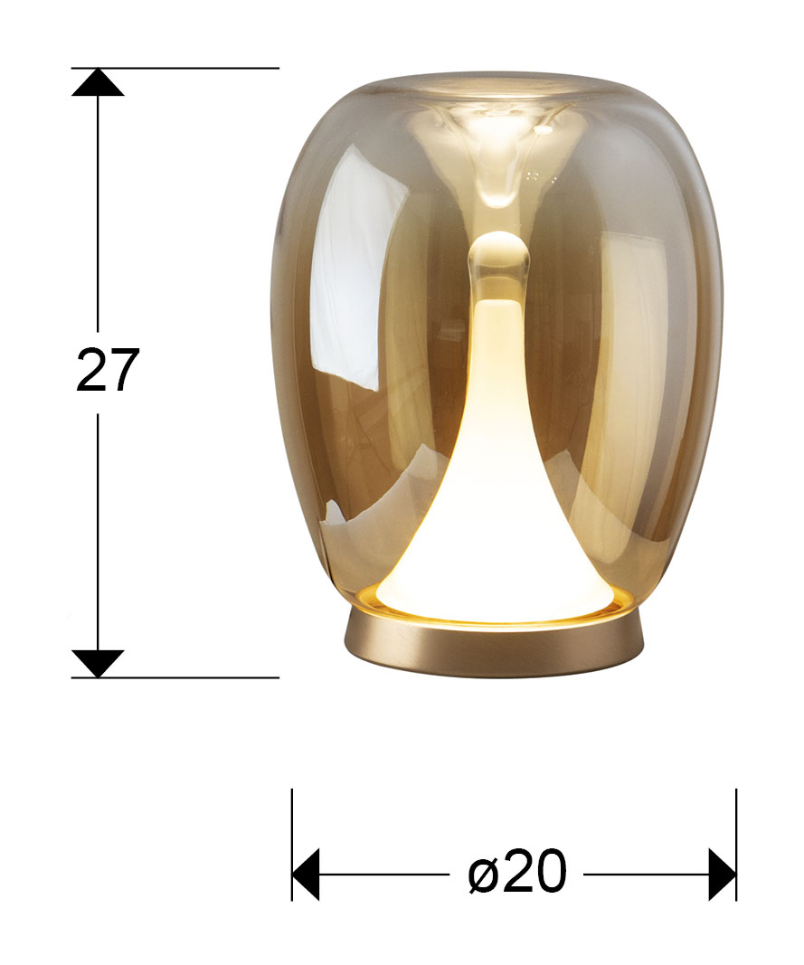 Lámpara de sobremesa realizada en aluminio dorado anodizado, con tulipa de cristal soplado acabado ambar degradado y difusor interior opal. 8,5W LED, 504 lm, 3.000 K.