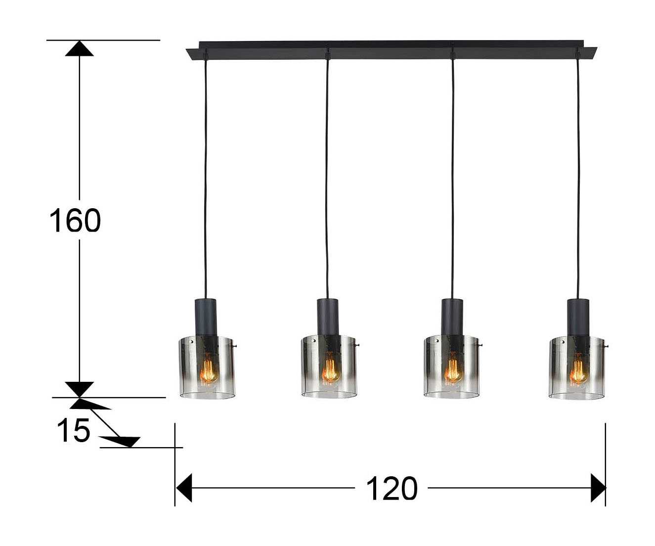 Lámpara realizada en metal acabado negro satinado. 4 Tulipas de cristal smoke difuminado. Cable textil. Regulable en altura. Portalámparas E27
