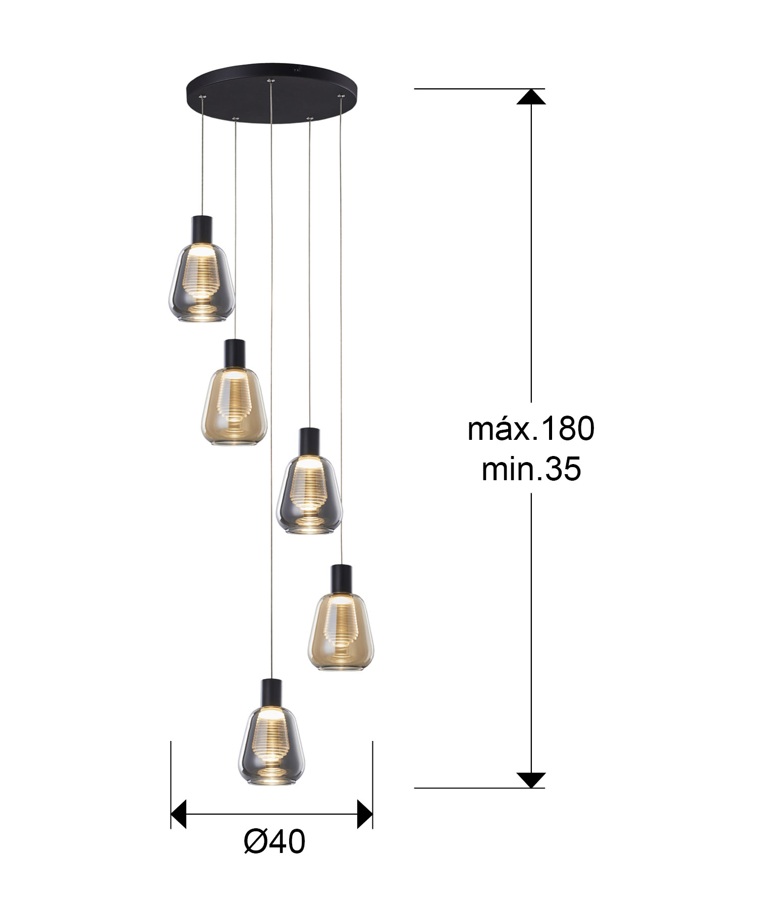 Lámpara de 5 luces, realizada en metal acabado negro mate. Doble tulipa, exterior realizada en cristal ámbar o smoke espejado, con difusor interior en policarbonato transparente con franjas escalonadas. Regulable en altura. 25W LED, 1.750 lm, 3.000k