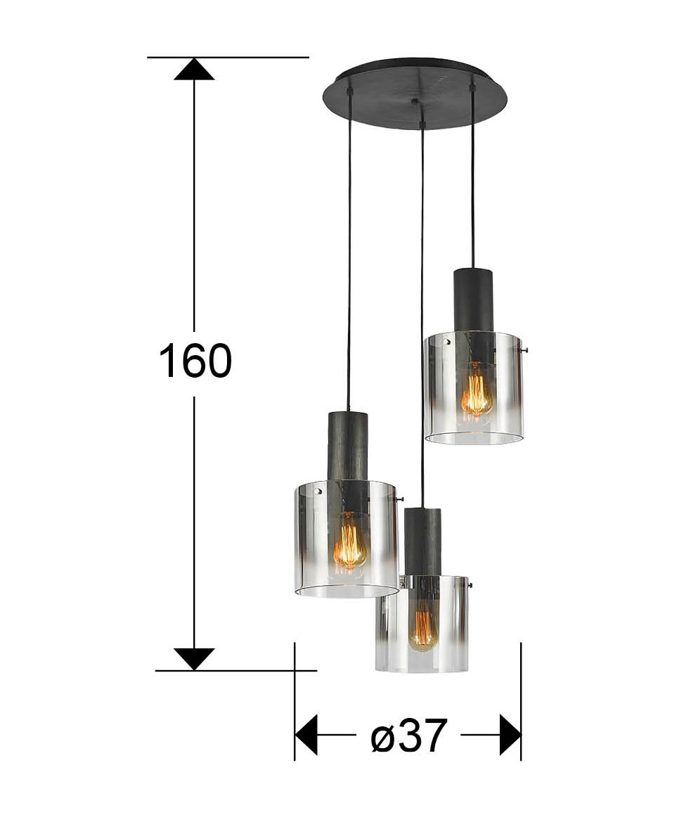Lámpara realizada en metal acabado negro satinado. 3 Tulipas de cristal smoke difuminado. Cable textil. Regulable en altura. Portalámparas E27