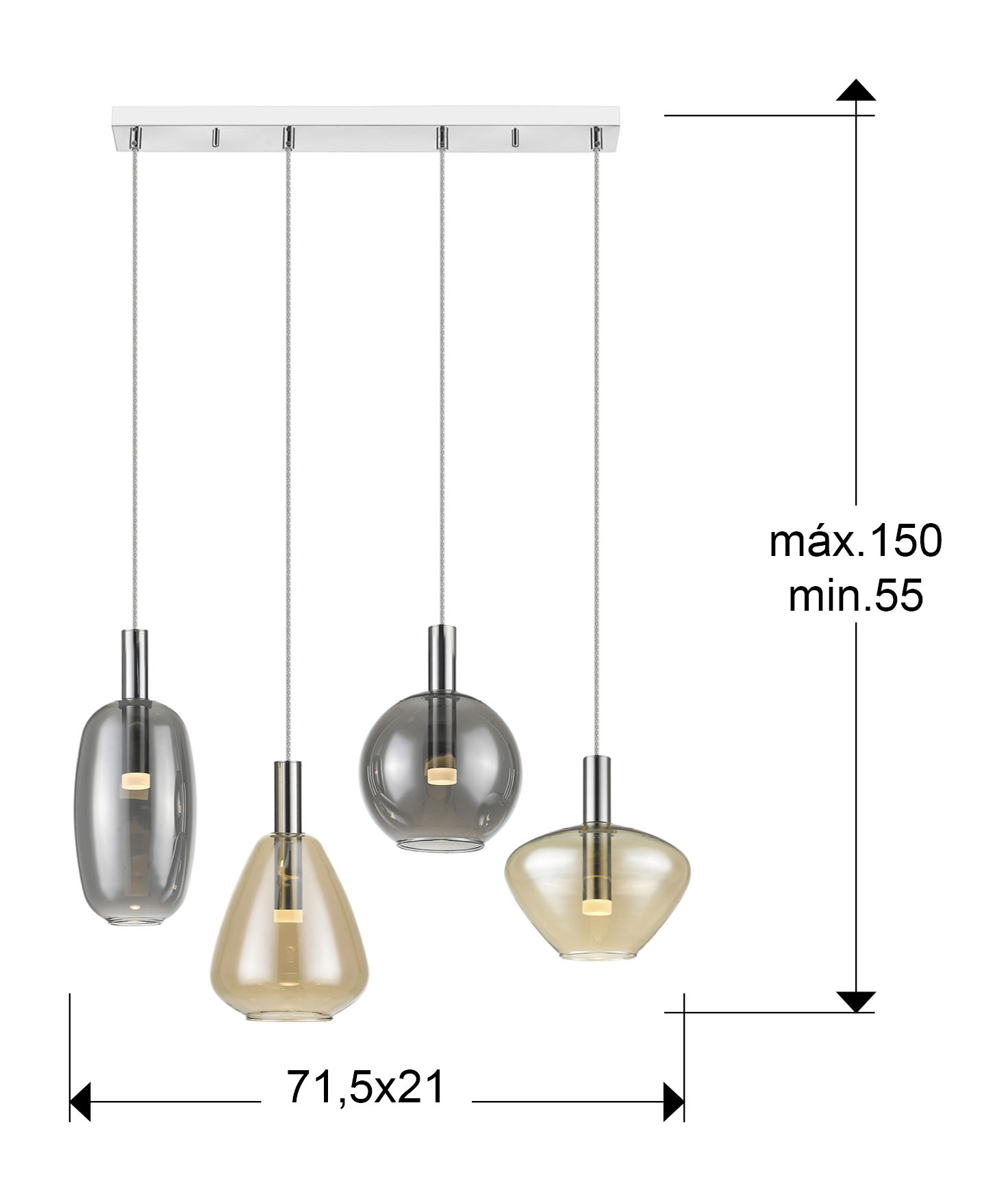 Lámpara de 4 luces, realizada en metal cromado. Tulipas combinadas de cristal ámbar y smoke, con difusor de acrílico opal. Altura regulable. 20W LED, 1.800 lm, 3.000 K.
