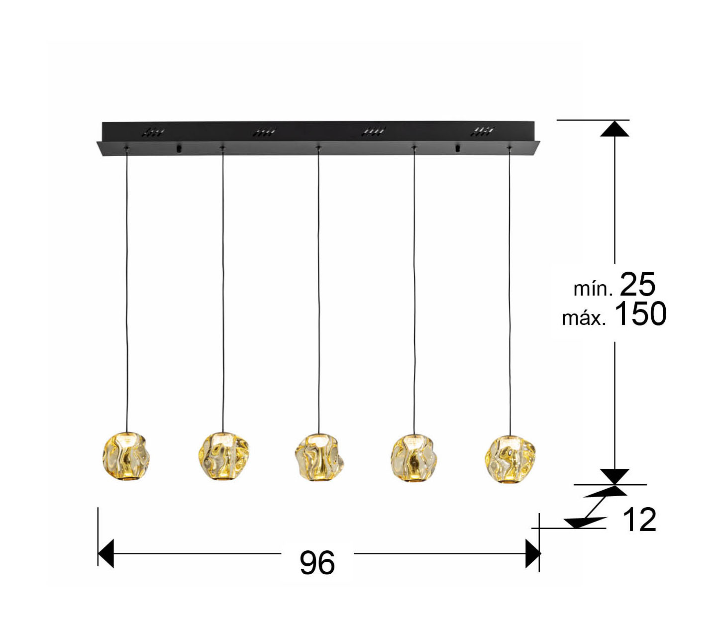 Lampara de 5 luces, realizada en metal acabado negro mate con detalles en bronce y tulipa de acrílico ambar. 21W LED, 1391 lm, 3000K. Incluye driver TRIAC y SET DIMADO.