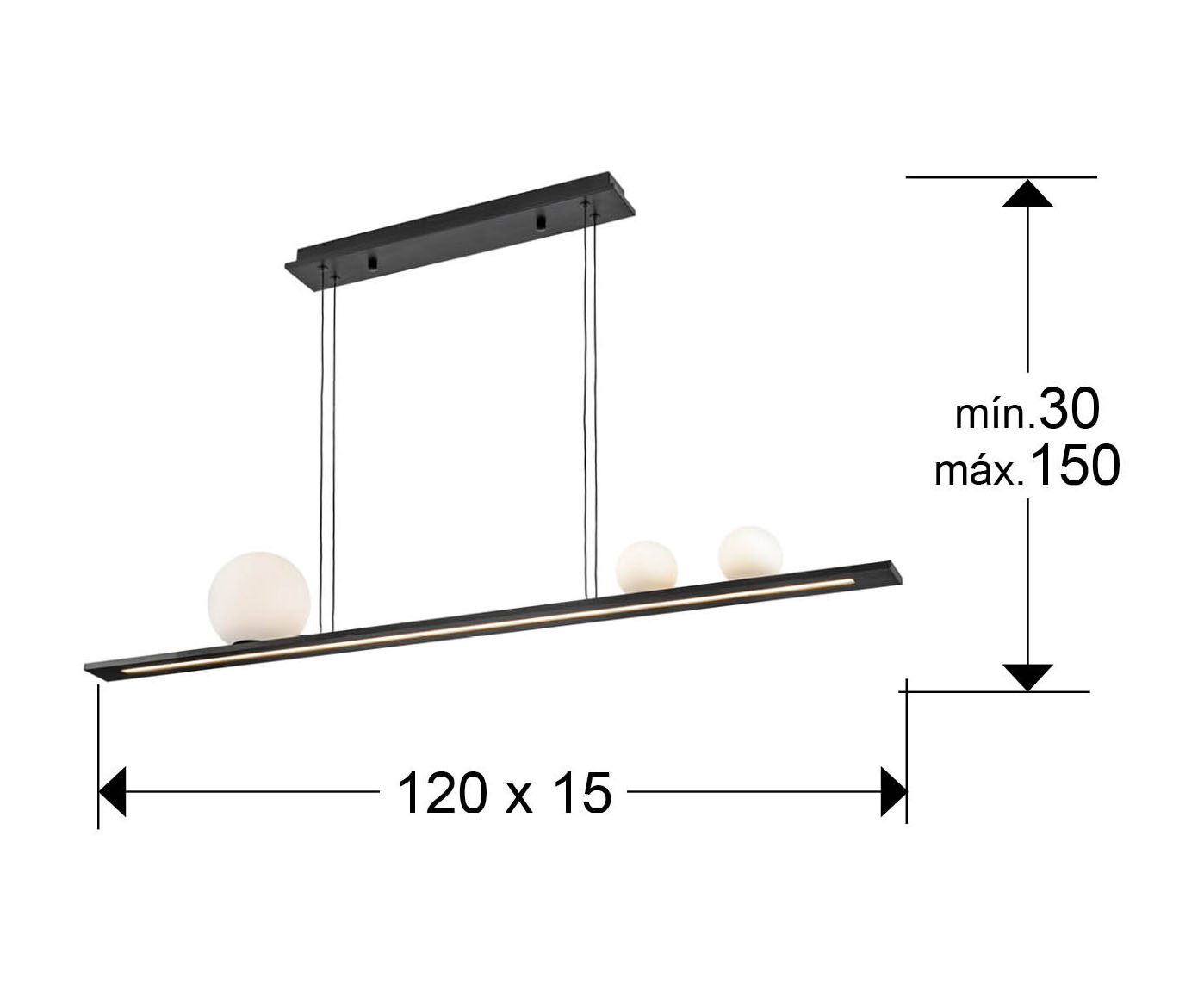 Lámpara realizada en aluminio cepilado, acabado negro. 3 tulipas esféricas de cristal matizado blanco y difusor inferior en acrílico opal. 31W LED, 1.204 lm, 3000K.