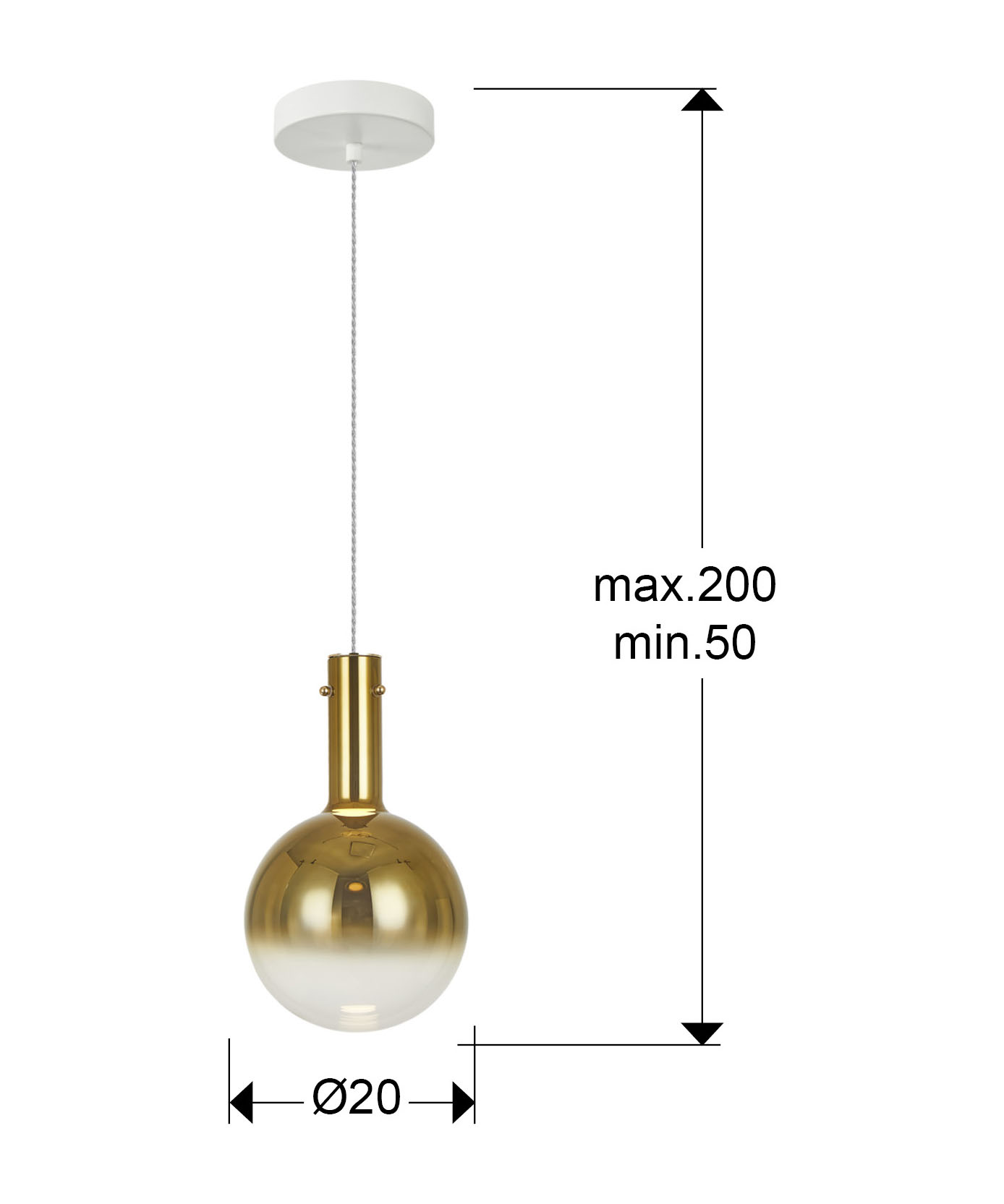 Lámpara realizada en metal, acabado blanco mate. Tulipa de cristal soplado de Ø20 cm, color oro espejado. Regulable en altura. 4W LED, 340 lm, 3000K.