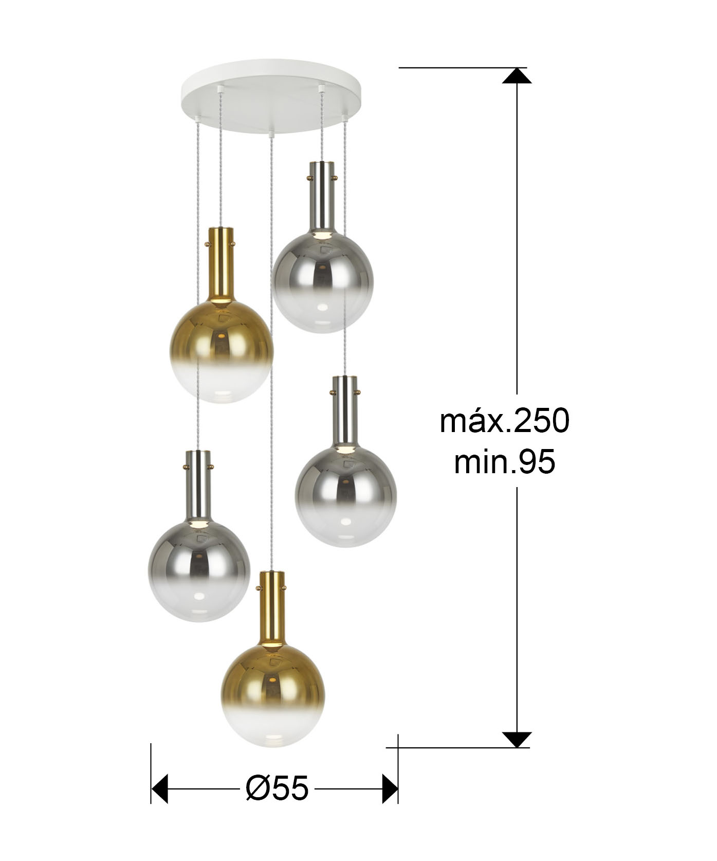 Lámpara realizada en metal, acabado blanco mate. Tulipas de cristal soplado de Ø20 cm, color gris smoke espejado y oro espejado. Regulable en altura. 30W LED, 2408 lm, 3000K.
