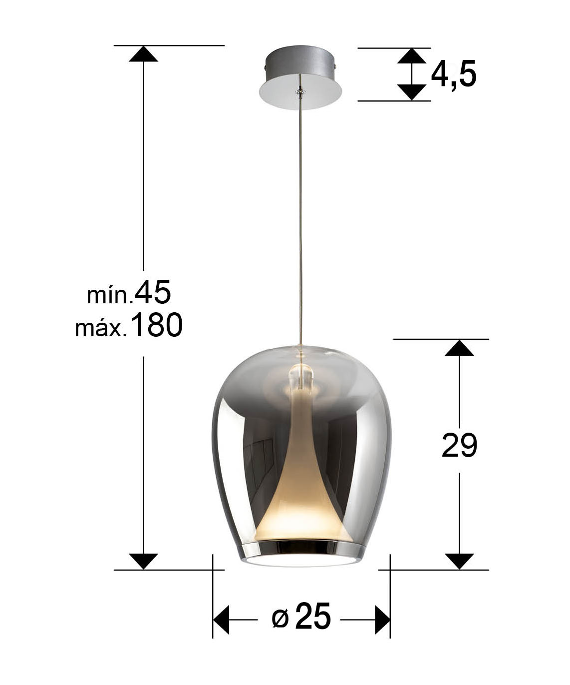 Lámpara realizada en aluminio cromado, con tulipa de cristal soplado acabado smoke degradado y difusor interior opal. Regulable en altura. 20W LED, 1200 lm, 3.000 K.