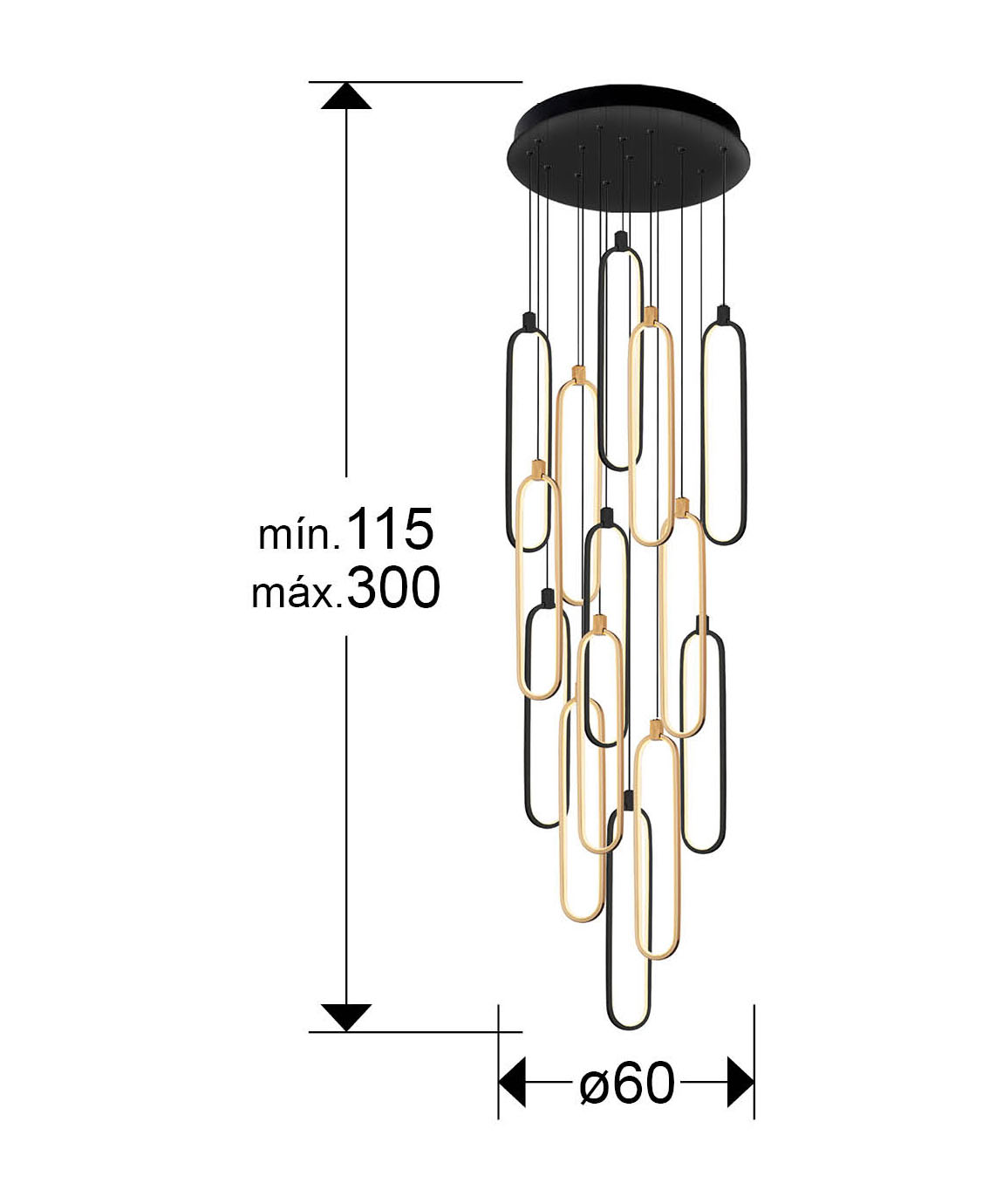 Lámpara de 14 luces LED, realizada en aluminio cepillado, acabado oro rosa y negro mate. Difusores de silicona opal. Regulable en altura. 182W LED, 16,380 lm, 3.000 K. Incluye driver TRIAC y SET DIMADO.