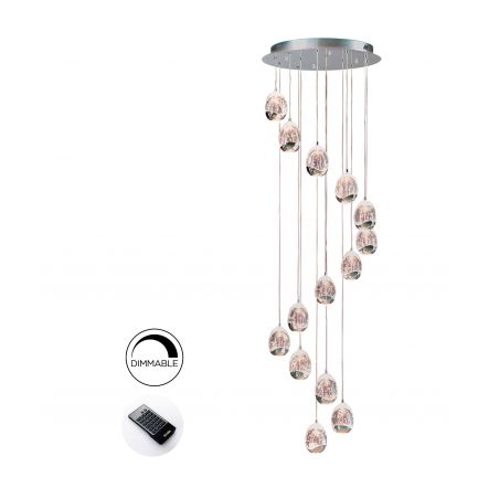 Lámpara esferoidal realizada en metal cromado. Varillas radiales de cristal transparente con las puntas decoradas en baño cromo oscuro. Altura regulable. DIMABLE.