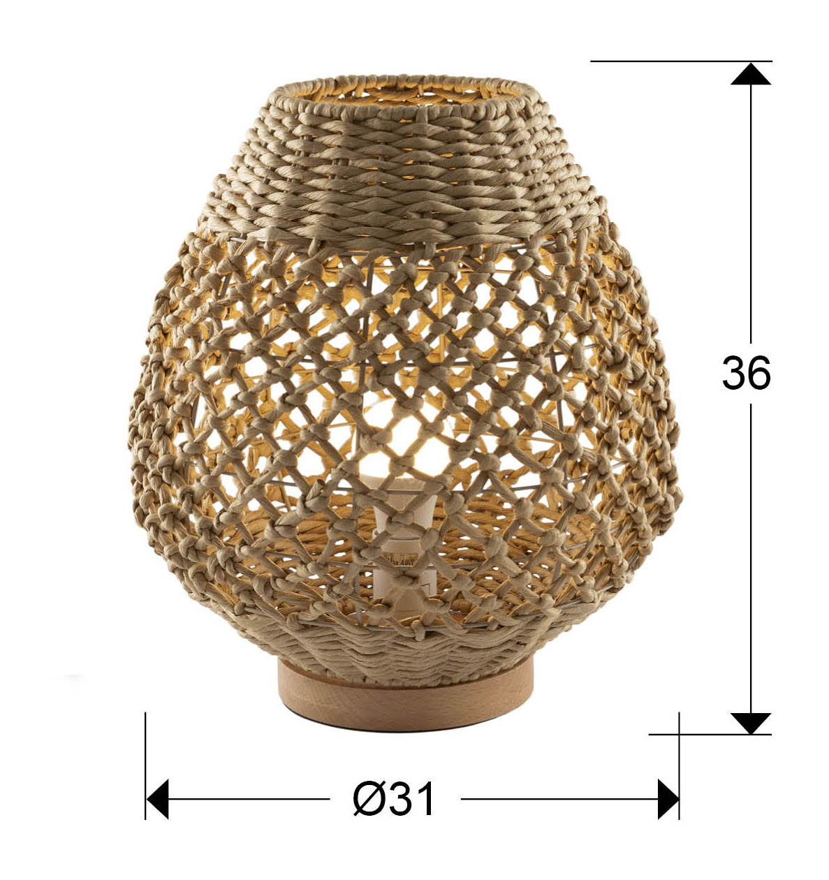 Lámpara de sobremesa pequeño de 1 luz, realizado en metal y madera, con pantalla de cuerdas de papel trenzado acabado beis.