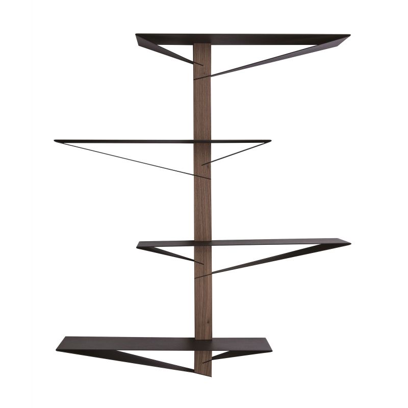 Librería de múltiples estantes metálicos lacados y soporte de pared en madera