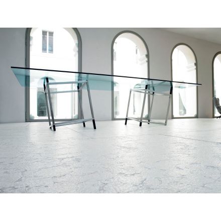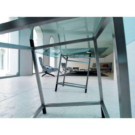 El volumen cúbico tridimensional a punto de desplomarse, realzado por la transparencia del tablero, le confiere un carácter y movimiento que atrapa al observador con un efecto visual inesperado. Un objeto de diseño matemático, riguroso y esencial, adecuado para entornos de trabajo como mesa de reuniones, espacios ejecutivos como escritorio o como refinada mesa de comedor en entornos domésticos. Détabilisation es una colección de mesas en las que la estructura rigurosa y esbelta soporta un tablero de cristal templado muy fino y transparente. Está disponible en dos formatos: No 1 cuadrada y No 2 rectangular.