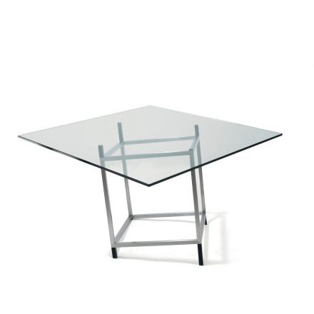 El volumen cúbico tridimensional a punto de desplomarse, realzado por la transparencia del tablero, le confiere un carácter y movimiento que atrapa al observador con un efecto visual inesperado. Un objeto de diseño matemático, riguroso y esencial, adecuado para entornos de trabajo como mesa de reuniones, espacios ejecutivos como escritorio o como refinada mesa de comedor en entornos domésticos. Détabilisation es una colección de mesas en las que la estructura rigurosa y esbelta soporta un tablero de cristal templado muy fino y transparente. Está disponible en dos formatos: No 1 cuadrada y No 2 rectangular.