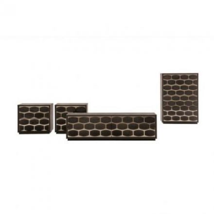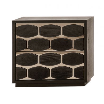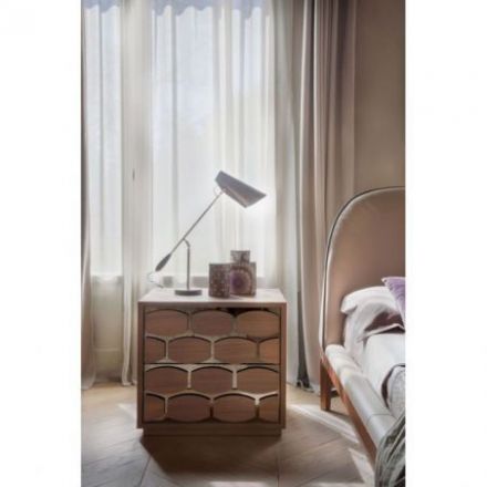 La cómoda, mesita de noche y cajonera Honey Night se distinguen por la compleja elaboración de las maderas, de nogal canaletto o roble oscuro termotratado, y la idónea selección de espejos que permiten conferir un efecto de amplitud al espacio.