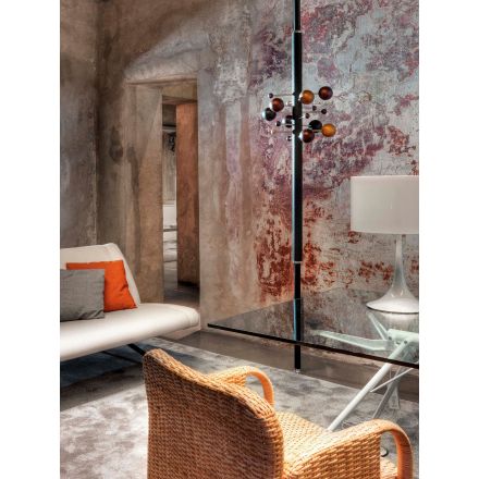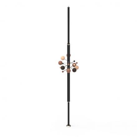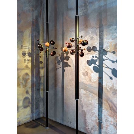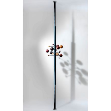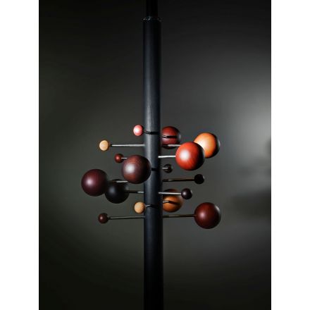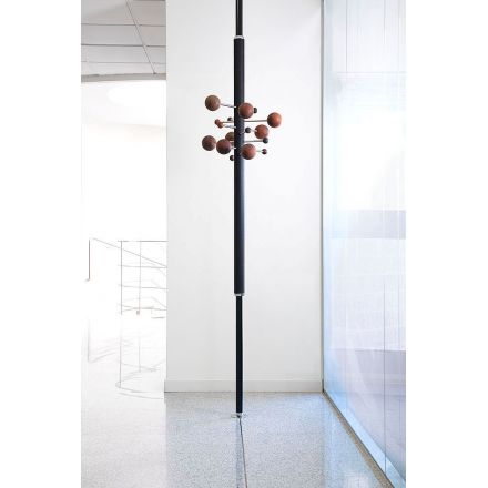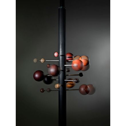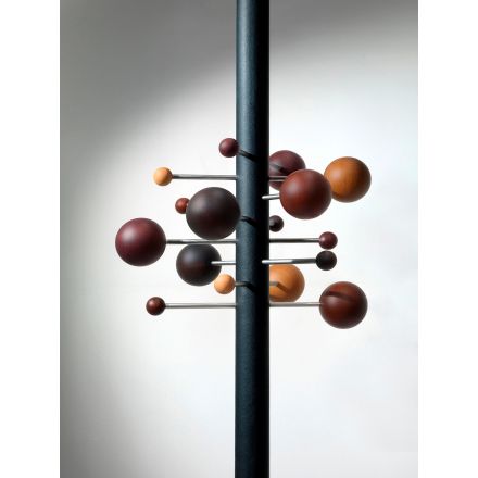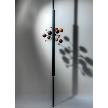 Del universo de Osvaldo Borsani, un diseño que crea un pequeño sistema solar, en sutil y suspendido equilibrio. Los materiales artesanales, extremadamente refinados, se encierran en un objeto gráfico, único y característico. La composición se acentúa por la repetición en paralelo de varias perchas para crear formas orgánicas y asimétricas o composiciones regulares y clásicas. AT16 es el precursor del perchero columna de suelo a techo, giratorio y regulable en altura.
