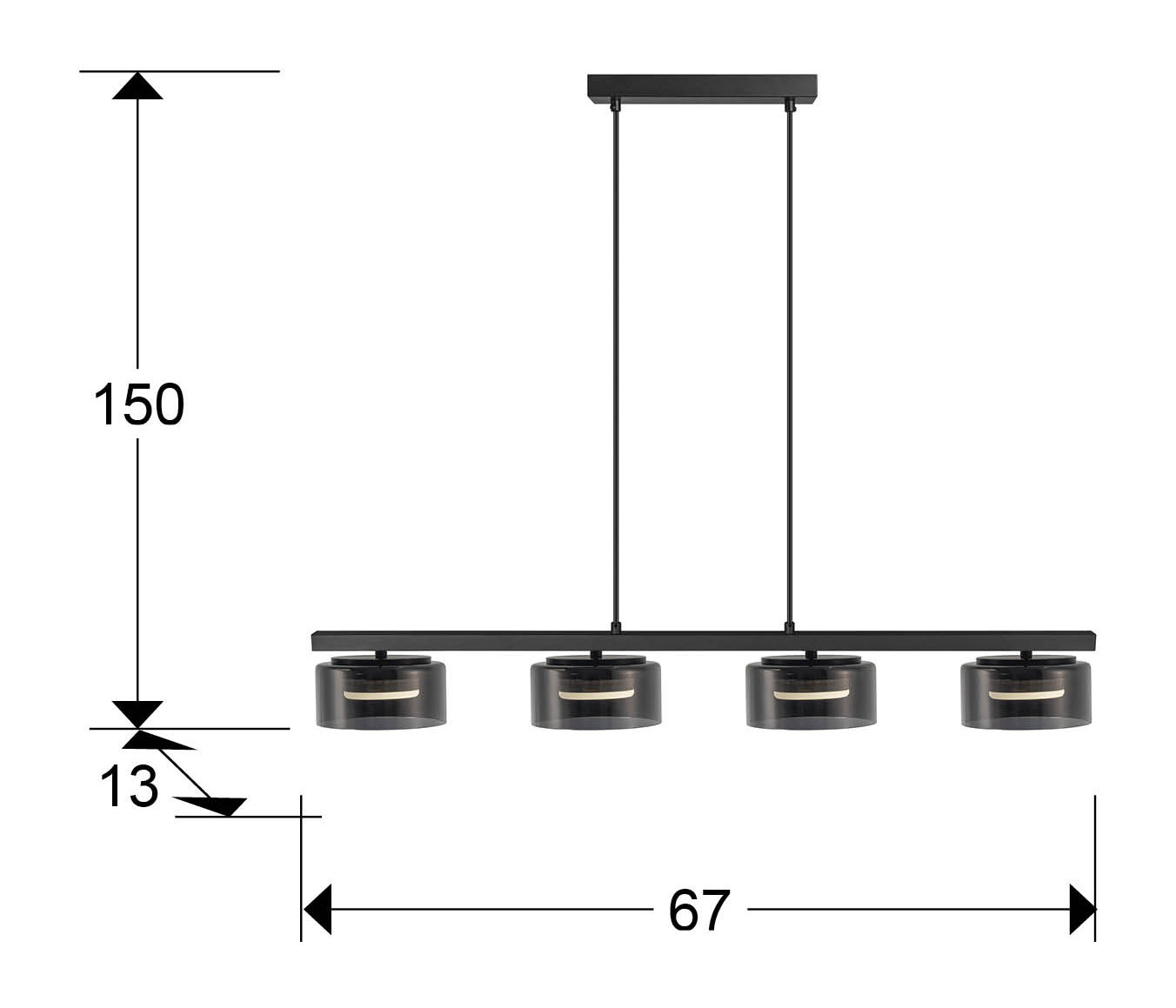 Lámpara realizada en metal acabado negro mate. 4 Tulipas de cristal smoky. Regulable en altura.