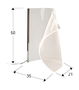 Lámpara de sobremesa formada por una lámina de metacrilato microimpreso moldeado y perfíl metálico cromo. Iluminación LED 10W 600 lm 3.000K. DIMABLE.