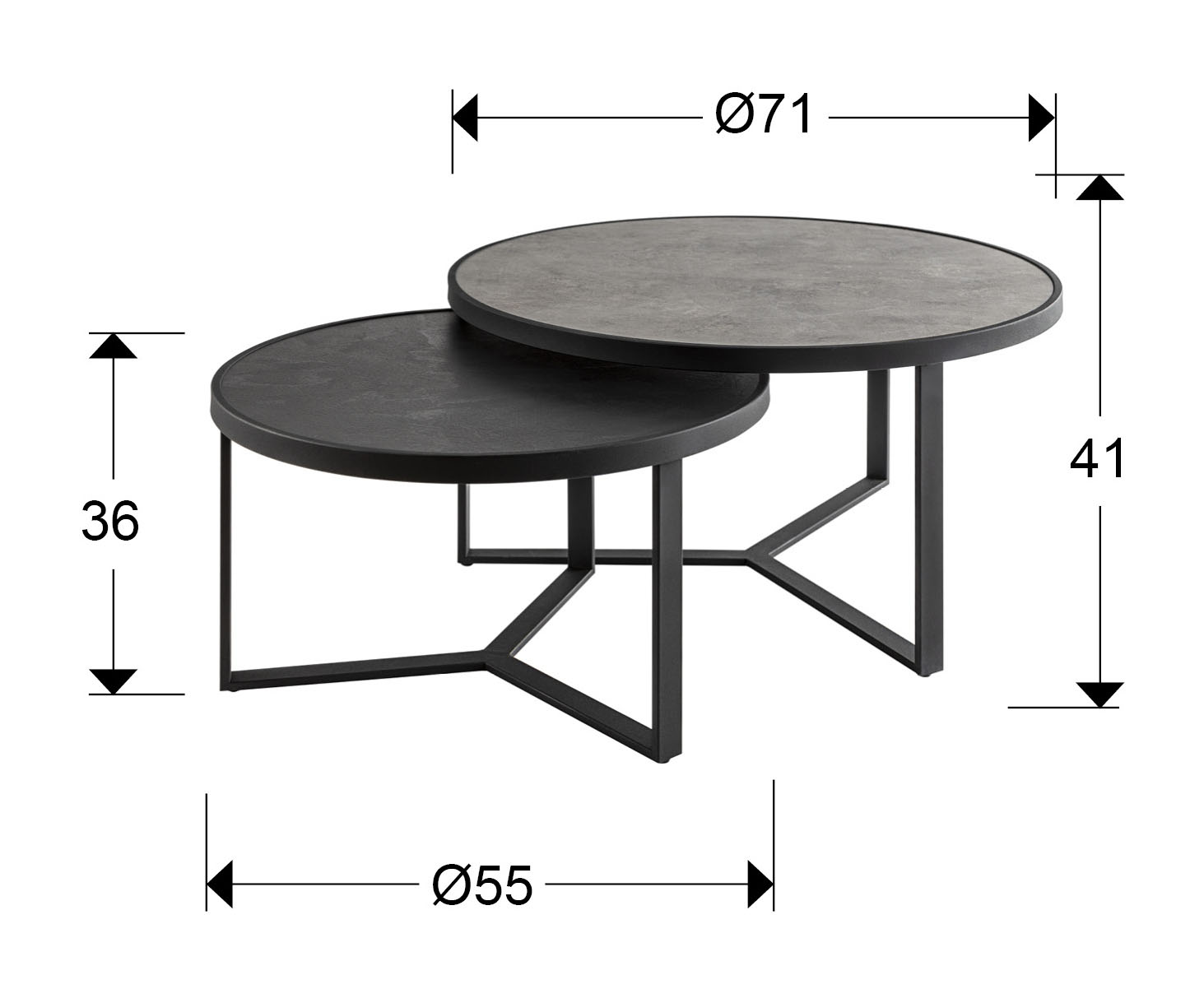 Pareja de mesas auxiliares pequeñas, realizadas en metal, acabado negro mate. Tapa de DM con superficie melamínica de alta resistencia, acabado piedra gris y negra.