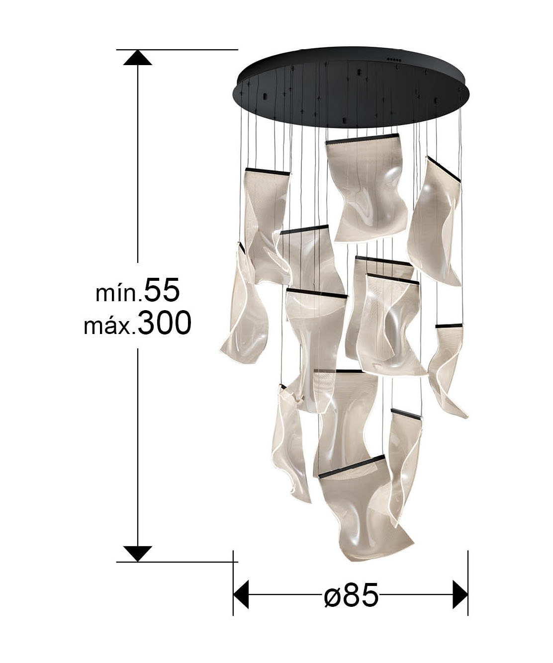 Lámpara realizada en metal acabado negro mate y tulipas de metacrilato microimpreso moldeado. Iluminación LED. DIMABLE,. 63W, 3.780 lm, 3.000K. Incluye driver TRIAC y SET DIMADO