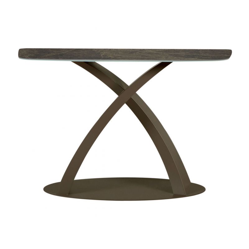 Una elegante ligereza envuelve la consola Eliseo, con base de acero en varios acabados