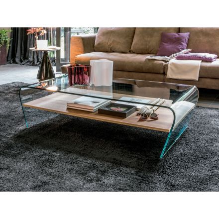 Una mesa de centro que combina la ligereza del cristal curvado con un estante de madera o cristal templado