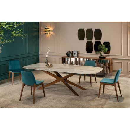 Mesa con base central de acero pintado o chapado en madera que se prolonga hacia el top