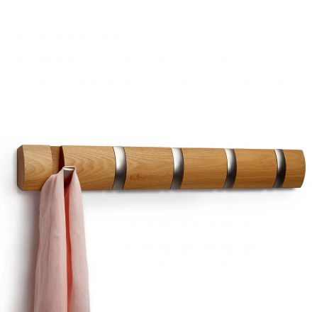 Perchero de pared moderno Flip 5 Umbra. Diseño David Quan. Estructura en madera y compuesto por cinco perchas abatibles. Acabado moderno y funcional en madera natural, color café y blanco.